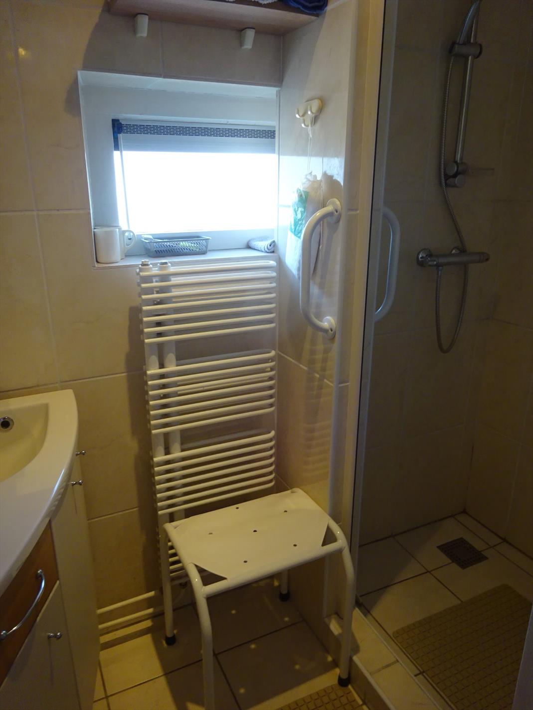 1e verdieping: overloop met trap naar 2e verdieping, 3 slaapkamers waarvan 1 met deur naar het balkon op het zuiden en verder een badkamer met douche en wasmeubel..